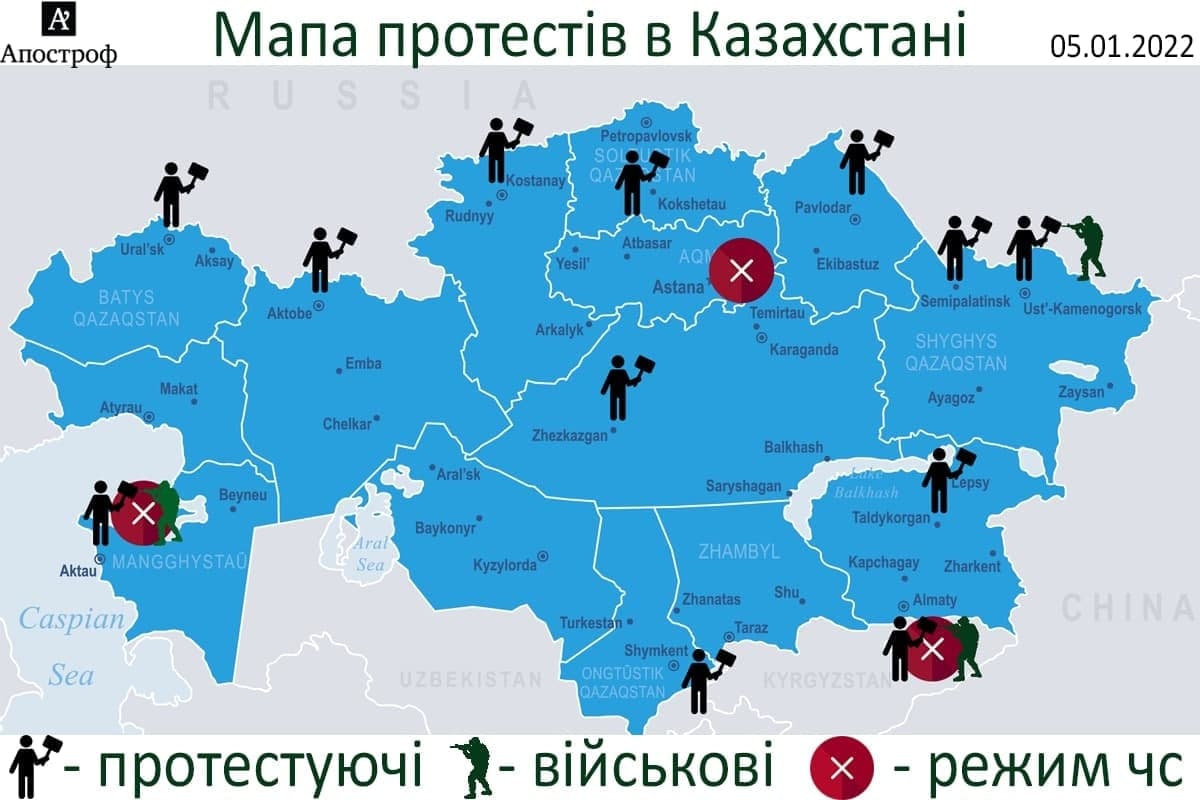 Сайт "Апостроф" создал карту протестов в Казахстане и выделил места наиболее ожесточенных столкновений.