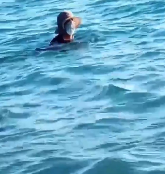 На видео видно, как женщина купается в море не только в шляпе, но и в защитной маске. Стоит отметить, что вокруг купальщицы людей не наблюдается и не совсем понятно, почему она решила использовать защиту от коронавируса в море.