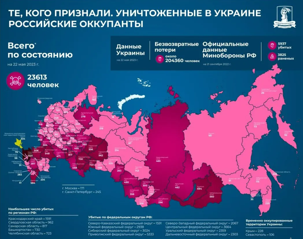 Так, по состоянию на 22.05 в списке – 23613 имя, по которым есть полные данные. Еще несколько сотен российских военнослужащих признаны убитыми, однако, из-за определенных нюансов и отсутствия полной вероятности, они не внесены в список.