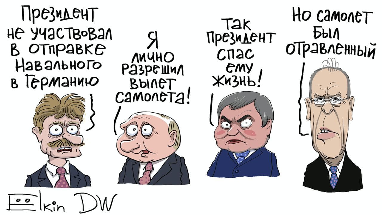 На карикатуре по этому поводу художник Елкин изобразил, как менялась риторика российской власти по поводу отравления оппозиционера и каким дисонансом прозвучало утверждение главного российского дипломата.