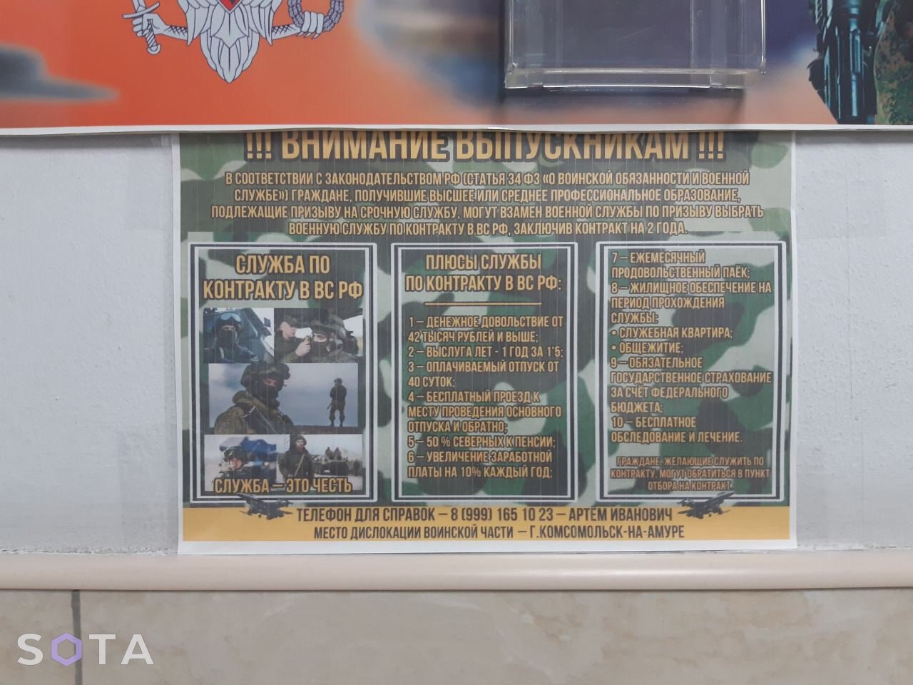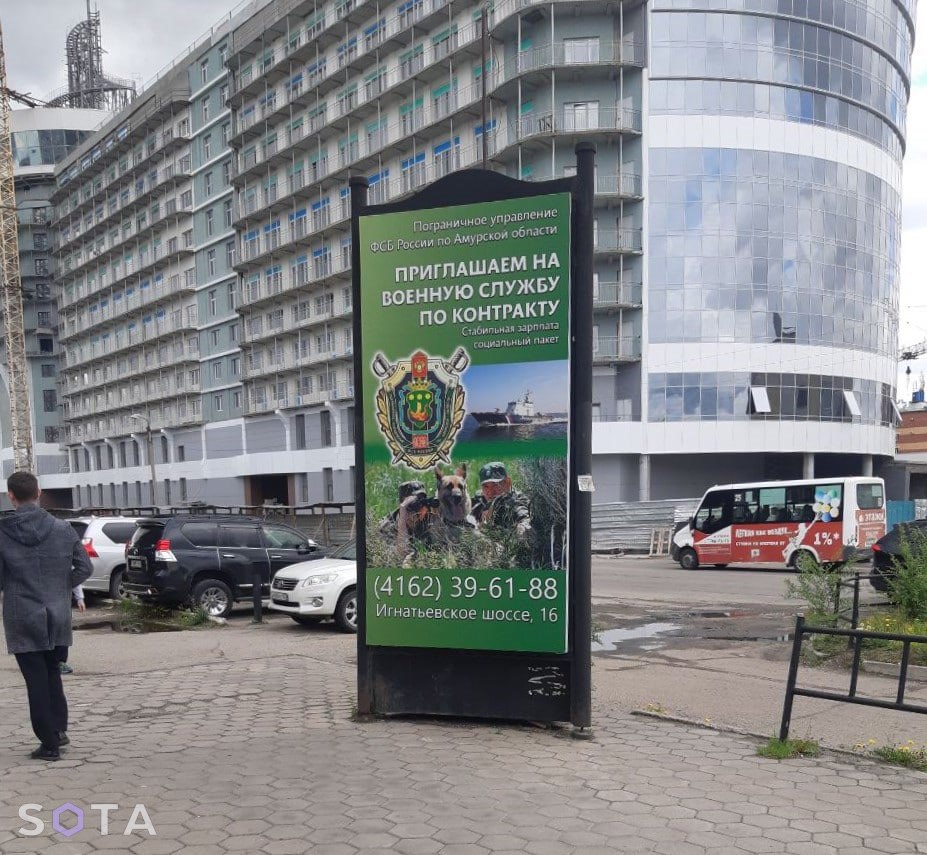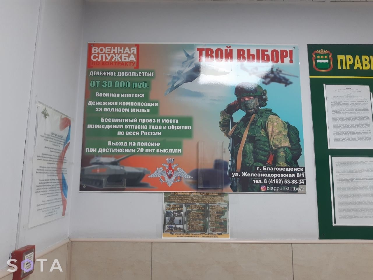 При этом призывают вступать не только в ряды вооруженных сил, но и других подразделений РФ. Напимер, в Амурской области приглашают подписать контракт с пограничной службой, которая подчиняется ФСБ.