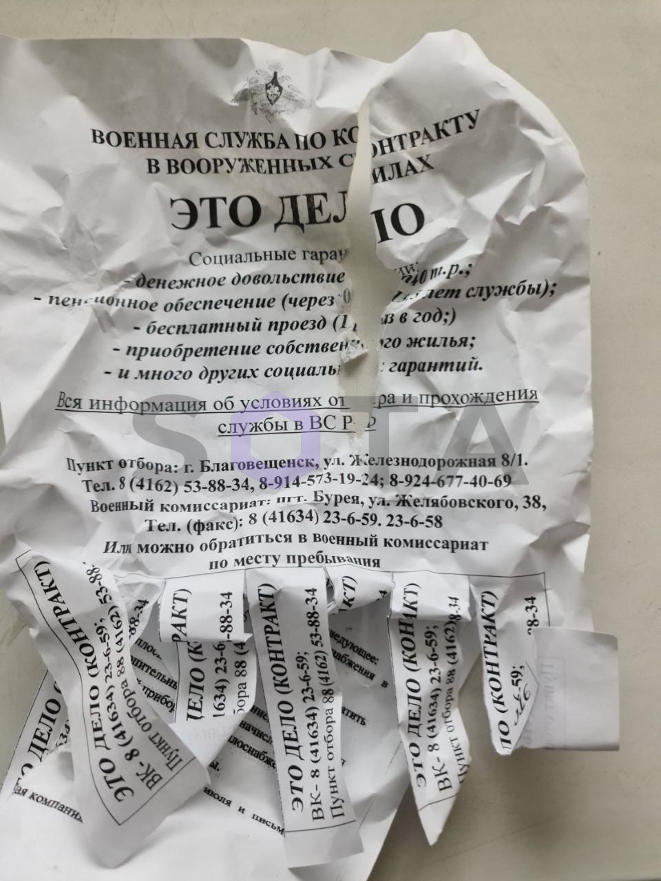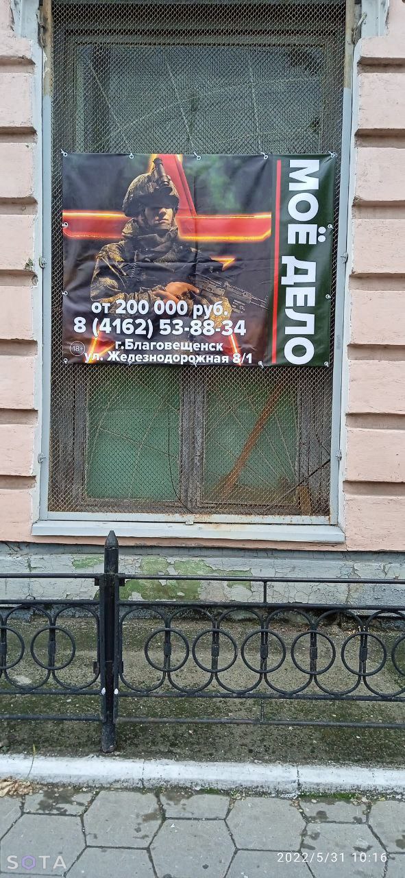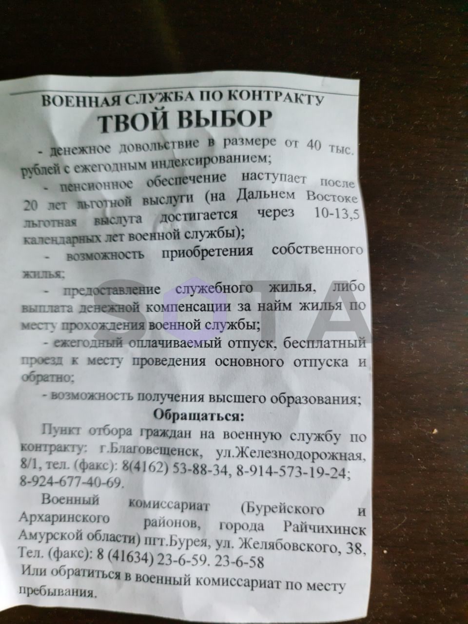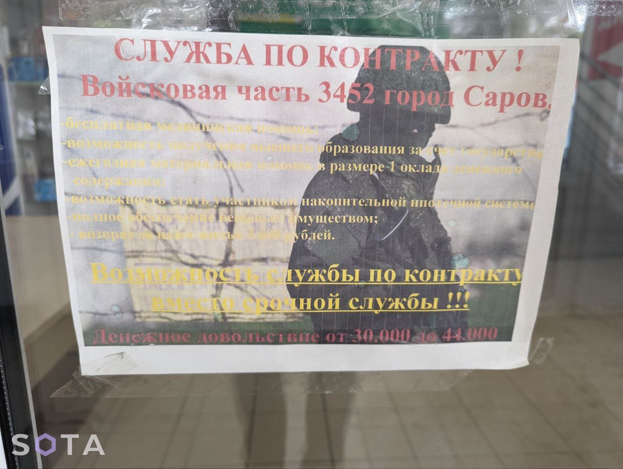 В Сарове, Благовещенске и других населенных пунктов страны-агрессора появились объявления с призывом вступать на контрактную военную службу. Россиянам обещают собственное жилье, льготы по выслуге лет, возможность получения высшего образования и прочие "блага цивилизации".