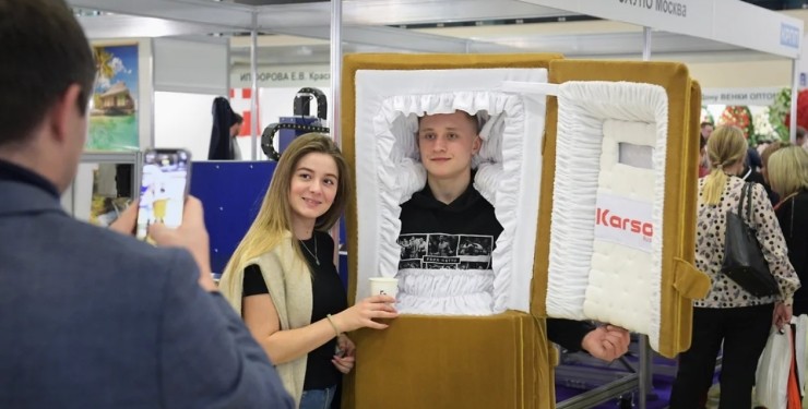 На московской выставке было много странного. Там показали новые модели гробов, надгробий, крестов и других погребальных аксессуаров. Людям предложили участвовать в художественных и музыкальных конкурсах и сделать фото с человеком в гробу.