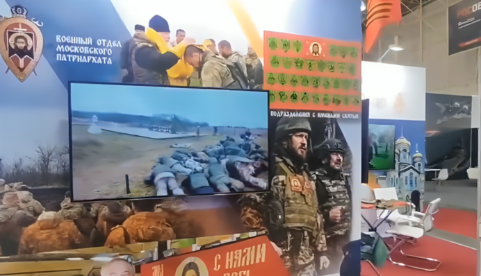 На российском форуме "Армия-2024" заметили стенд РПЦ с "именами святых" и бронепластинами с иконами.