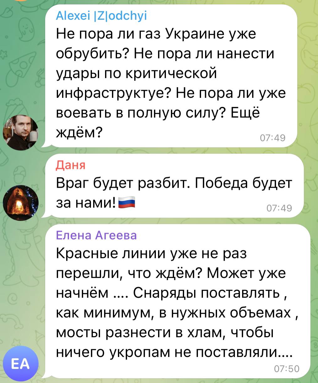 Другие рашисты предлагают начать "воевать в полную силу", "мосты уничтожить в хлам", чтобы украинцам не снабжали оружие, "обрубать газ". Некоторые люди просто пишут пустые лозунги, вроде "Победа будет за нами". А некоторые предполагают, что России теперь придется "в этом жить, как Израиль".