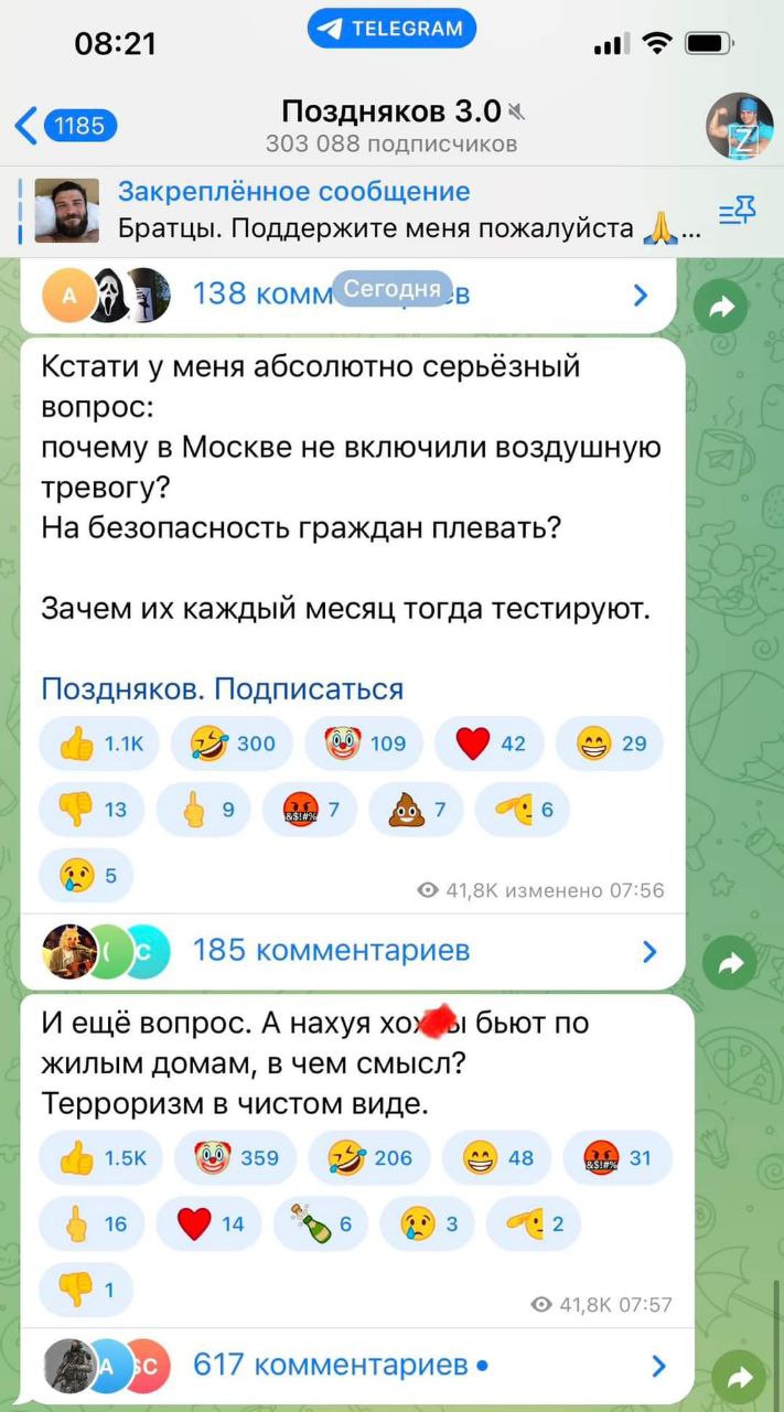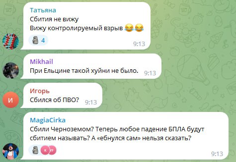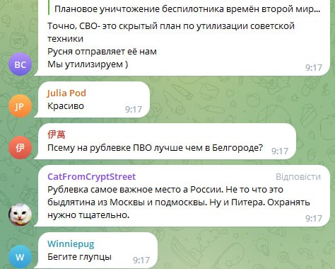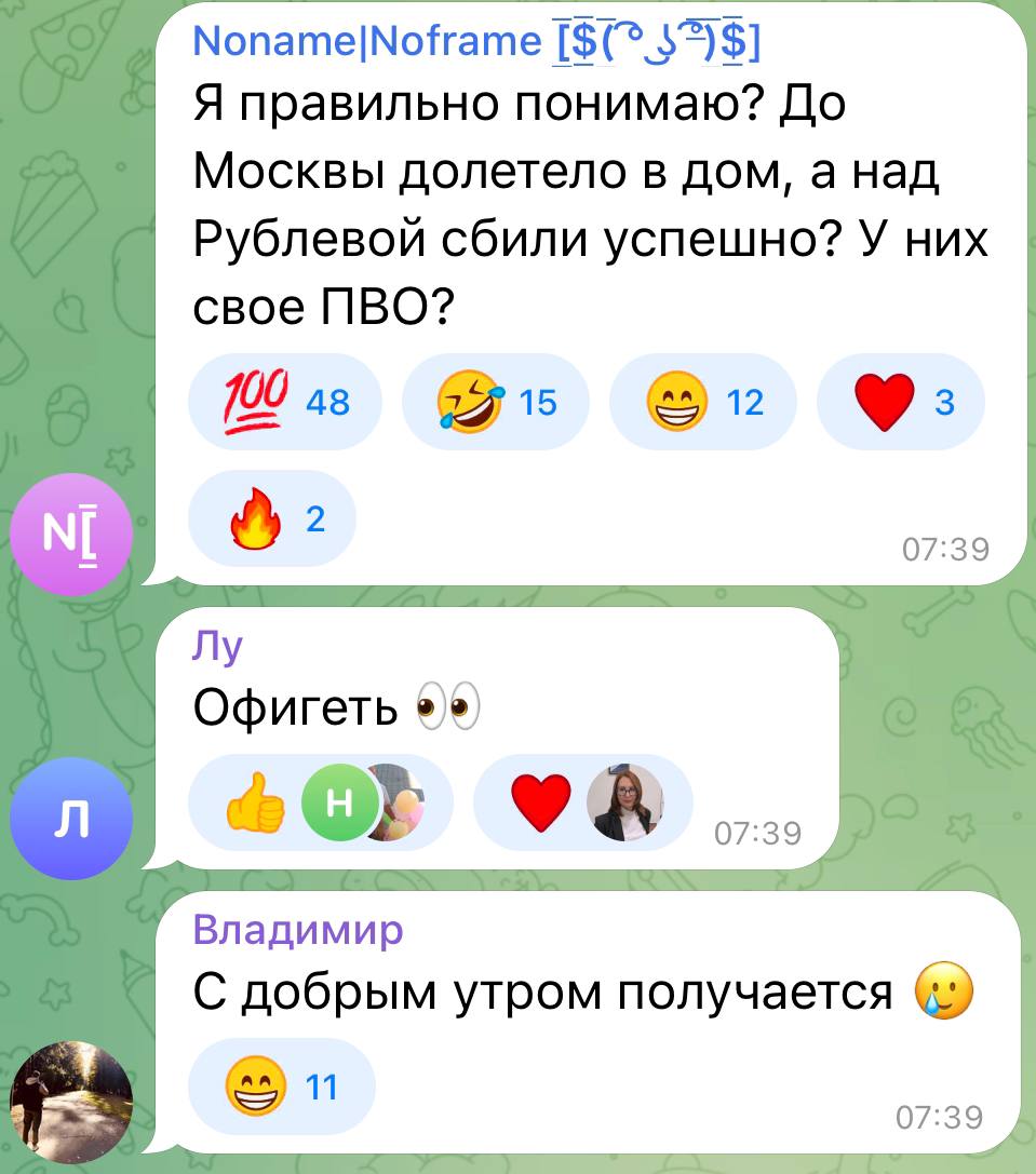 Комментарии еще одной категории россиян наглядно демонстрируют всю их сущность – они возмущаются, что дроны над элитным районом Рублевкой сбили, а на профсоюзной улице – нет.