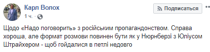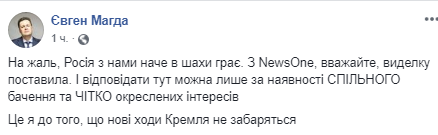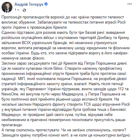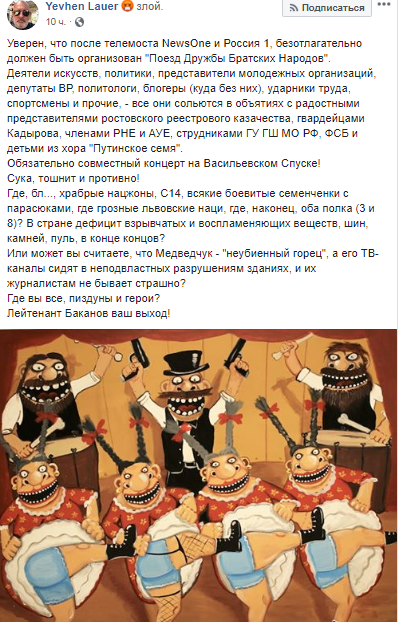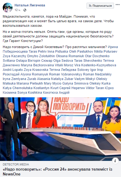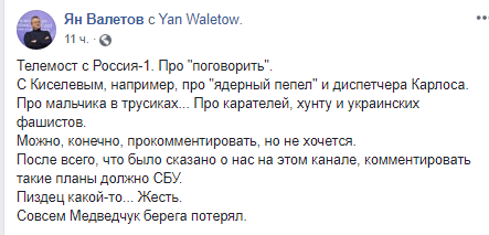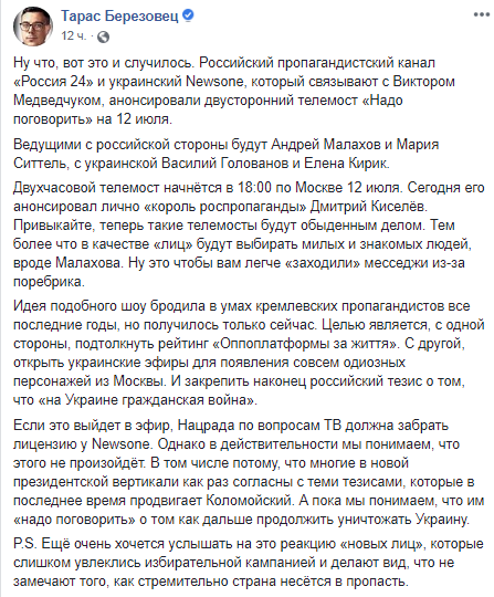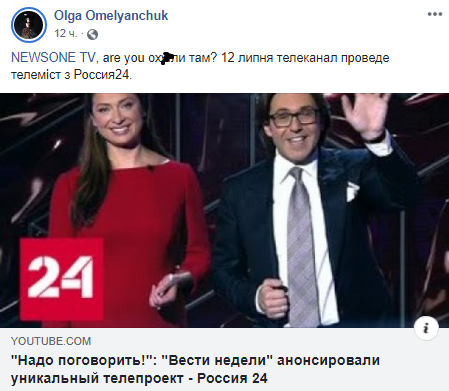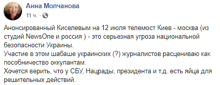 "Анонсированный Киселевым на 12 июля телемост Киев - москва (из студий NewsOne и россия ) - это серьезная угроза национальной безопасности Украины. Участие в этом шабаше украинских (?) журналистов расцениваю как пособничество оккупантам. Хочется верить, что у СБУ, Нацрады, президента и т.д. есть яйца для решительных действий", - журналистка Анна Молчанова.