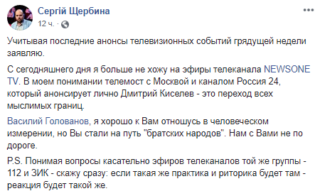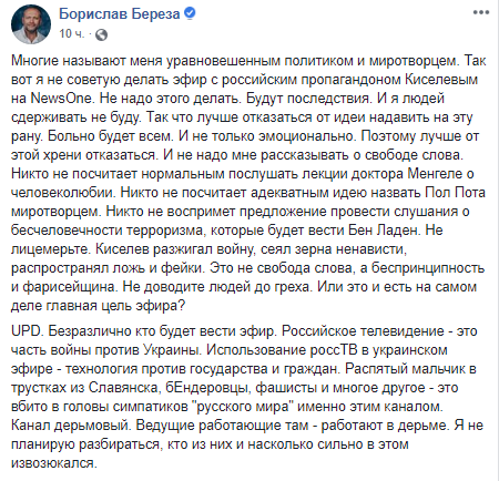 "Так вот я не советую делать эфир с российским пропагандоном Киселевым на NewsOne. Не надо этого делать. Будут последствия. И я людей сдерживать не буду. Так что лучше отказаться от идеи надавить на эту рану. Больно будет всем", - народный депутат Борислав Береза.