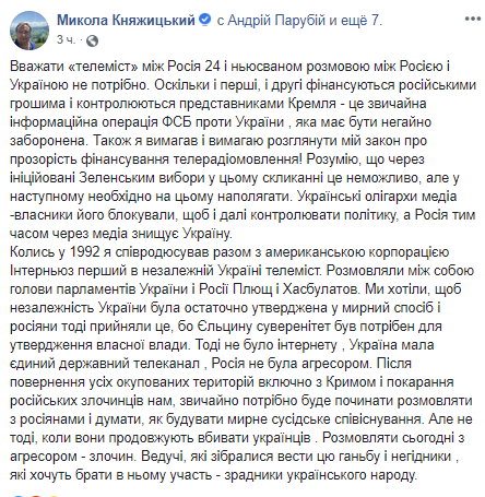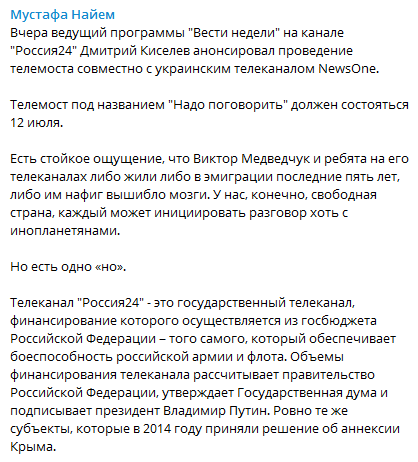 "Есть стойкое ощущение, что Виктор Медведчук и ребята на его телеканалах либо жили либо в эмиграции последние пять лет, либо им нафиг вышибло мозги. У нас, конечно, свободная страна, каждый может инициировать разговор хоть с инопланетянами", - написал в Telegram-канале журналист и нардеп Мустафа Найем.