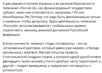 "Телеканал "Россия24" - это государственный телеканал, финансирование которого осуществляется из госбюджета Российской Федерации – того самого, который обеспечивает боеспособность российской армии и флота. Объемы финансирования телеканала рассчитывает правительство Российской Федерации, утверждает Государственная дума и подписывает президент Владимир Путин. Ровно те же субъекты, которые в 2014 году приняли решение об аннексии Крыма", - добавил он.
