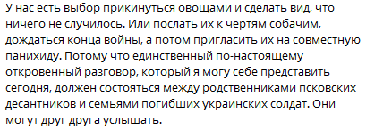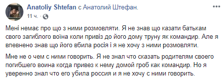 "Мне не о чем с ними говорить. Я не знал что сказать родителям своего погибшего воина когда привез к нему домой гроб как командир. Но я уверенно знал что его убила россия и я не хочу с ними говорить", - офицер ВСУ Анатолий Штефан.