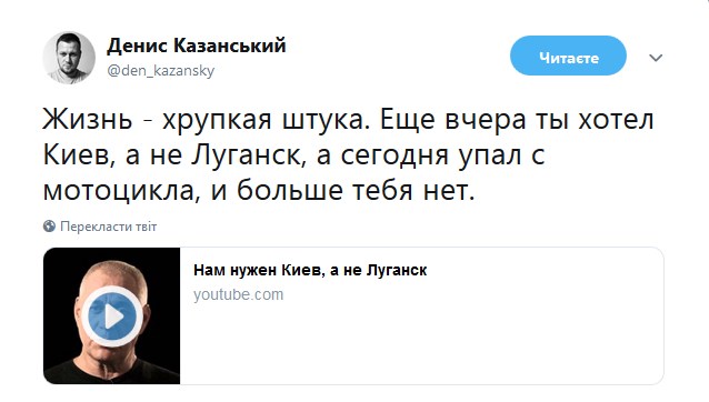 "Жизнь - хрупкая штука. Еще вчера ты хотел Киев, а не Луганск, а сегодня упал с мотоцикла, и больше тебя нет", - написал он.