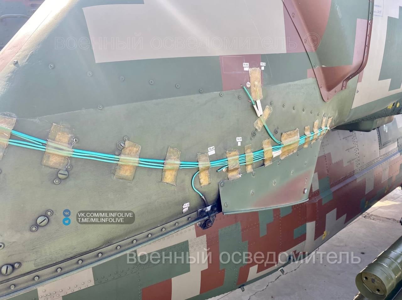 На втором фото задняя часть фюзеляжа продемонстрирована поближе. На снимке видно, как у самого хвоста вертолета, снаружи корпуса, к нему приклеен скотчем целый жмут электропроводов. По каким-то причинам проводку от одного агрегата к другому пустили не внутри, под защищенной броней обшивкой, а снаружи. Причем ранее это решение эксплуатировалось, о чем свидетельствуют следы копоти и гари возле провода заземления.