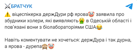 Кроме того, Яровая заявила, что возбудители холеры, которые якобы обнаруживают в Одесской области, также связаны с биолабораториями Пентагона.