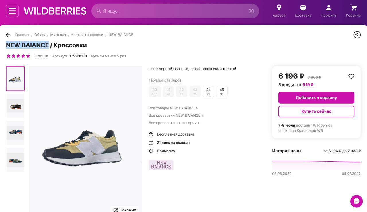 Крупнейшие интернет-магазины страны-изгнанника России начали массово продавать подделки на известные бренды, вышедших с российского рынка после начала полномасштабной войны. Руководство сайтов отказывается блокировать такие объявления, поэтому вместо "New Balance" россияне покупают "New Baiance" - "импортозамещение" в действии.