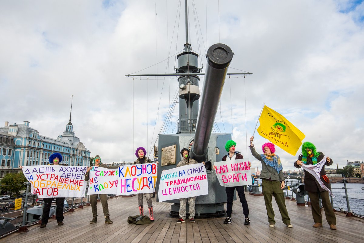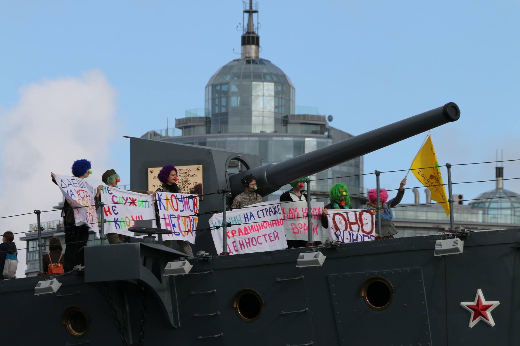 В российском городе Санкт-Петербург активисты в костюмах клоунов провели пародийную антимилитаристскую акцию на крейсере "Аврора".