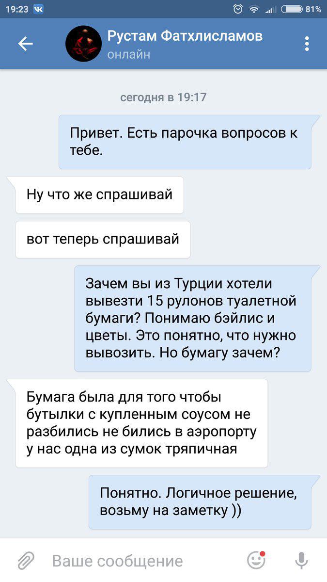 В сеть попали скриншоты переписки с Рустамом Фахтлисламовым, в которой он рассказал, зачем его семье понадобились более десяти рулонов туалетной бумаги.