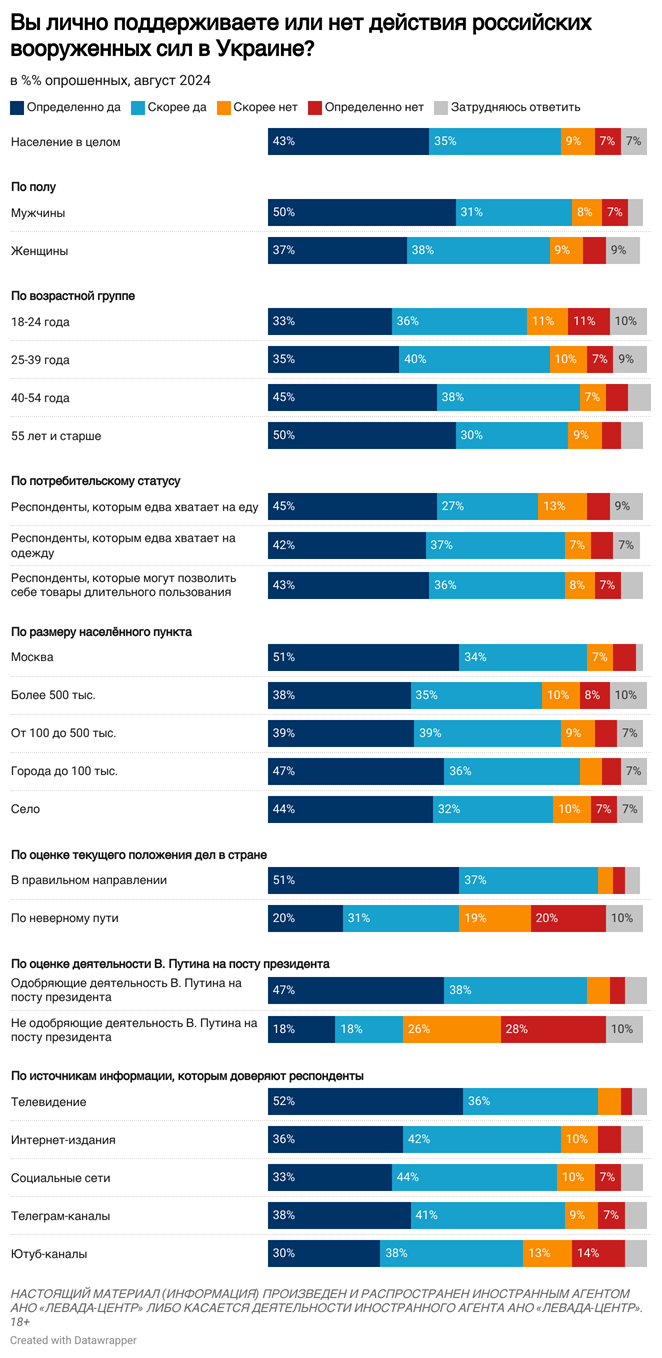 Ниже уровень поддержки действий российских военных среди женщин (75%), опрошенных в возрасте 18-24 лет (69%), респондентов, которым едва хватает на еду (72%), жителей городов с населением более 500 тысяч человек (73%), тех, кто считает, что страна движется по неверному пути (51%), тех, кто не одобряет деятельность президента (36%), опрошенных, которые доверяют информации из социальных сетей и ютуб-каналов (по 68%).