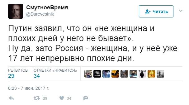 "Я не женщина, так что у меня нет плохих дней. Я не пытаюсь никого оскорбить. Это просто природа вещей. Существуют определенные естественные циклы", - так Путин объяснил, почему у него никогда не было выходных на посту президента РФ.