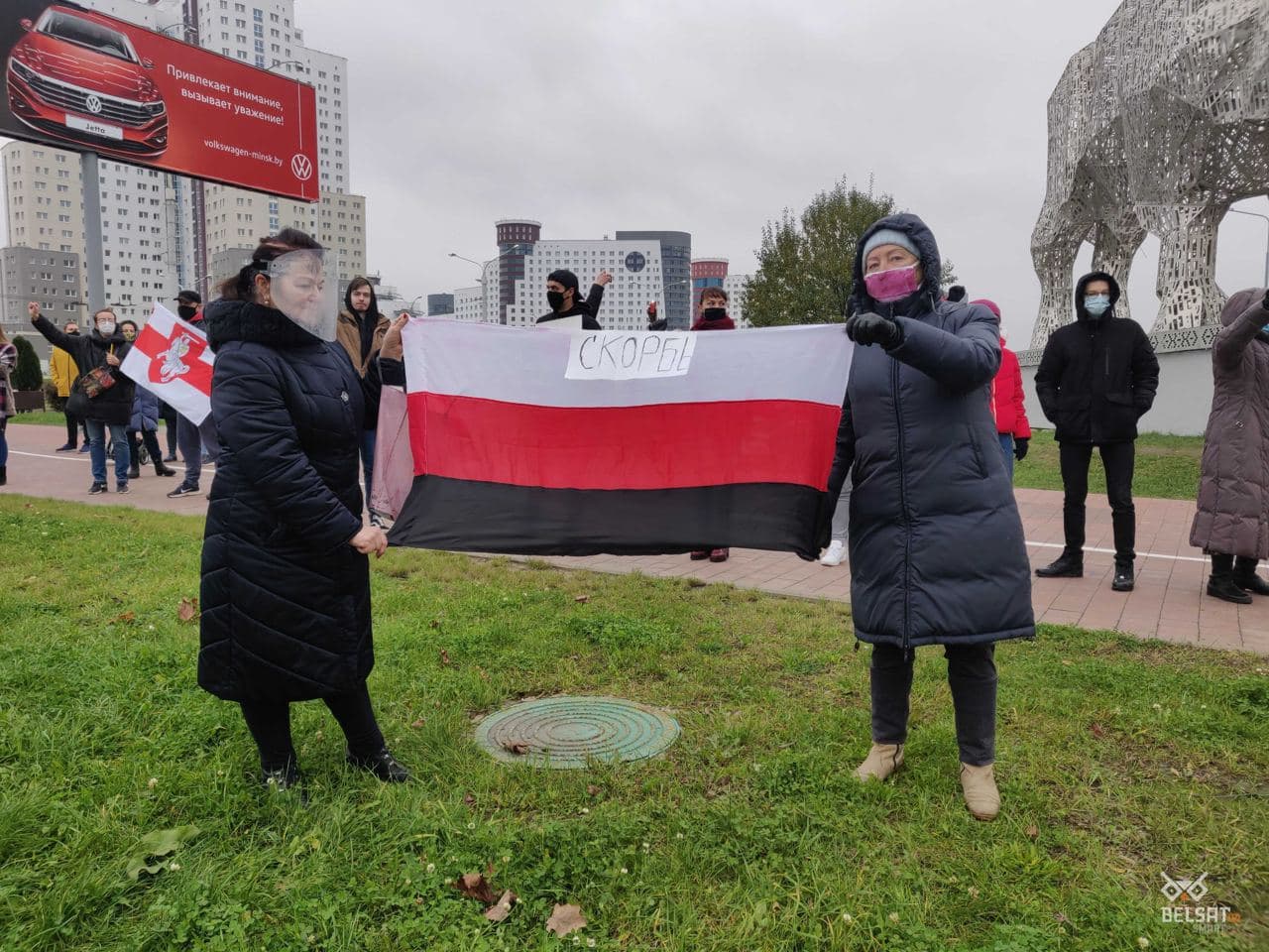 Акция началась в полдень. Ее участники пришли с национальной белоруской символикой - бело-красно-белыми флагами и гербом Погоня, некоторые принесли красно-белые цветы, которыми почтили память 31-летнего Роман Бондаренко, умершего в больнице после того, как его на акции протеста избили силовики.