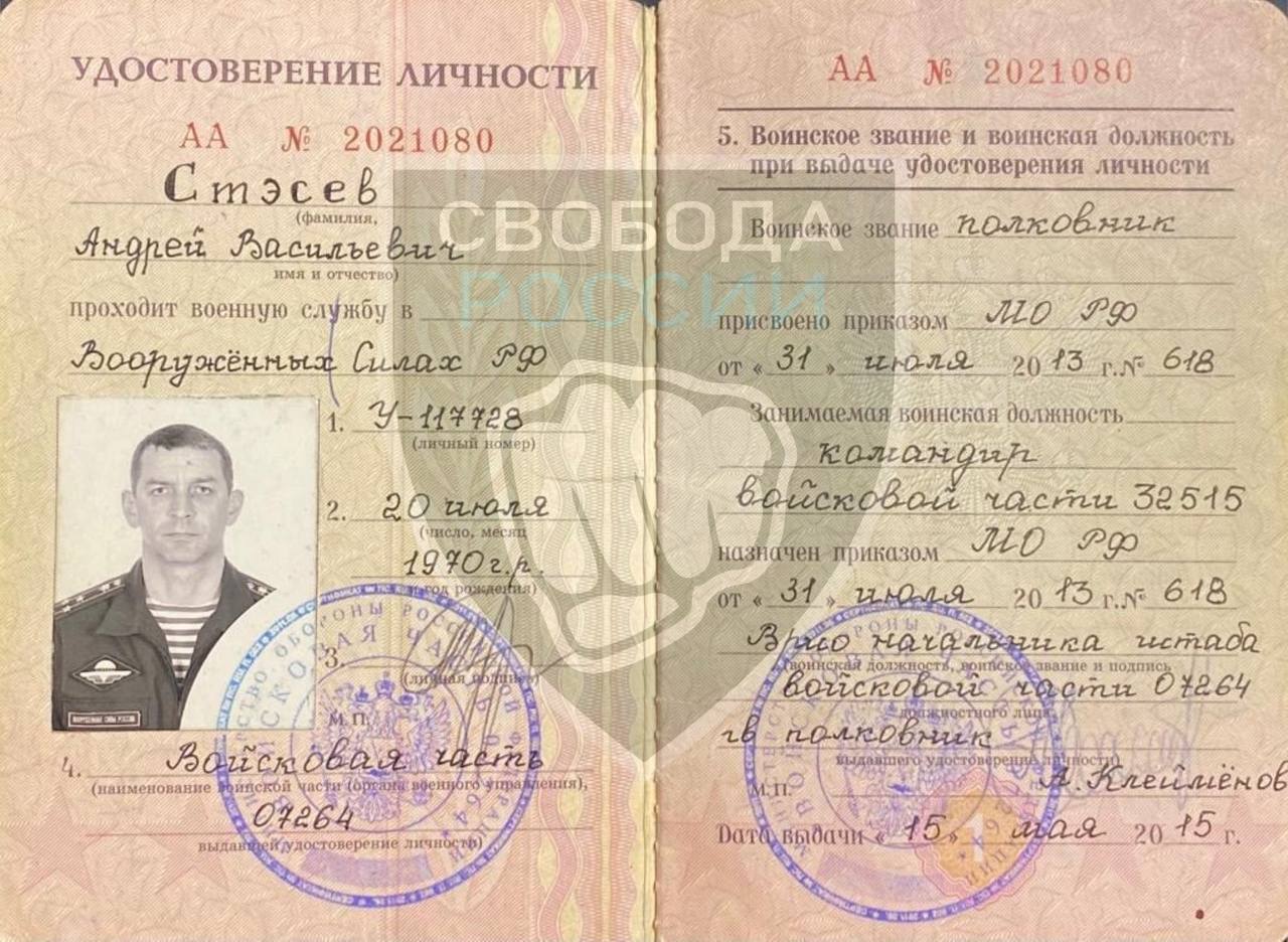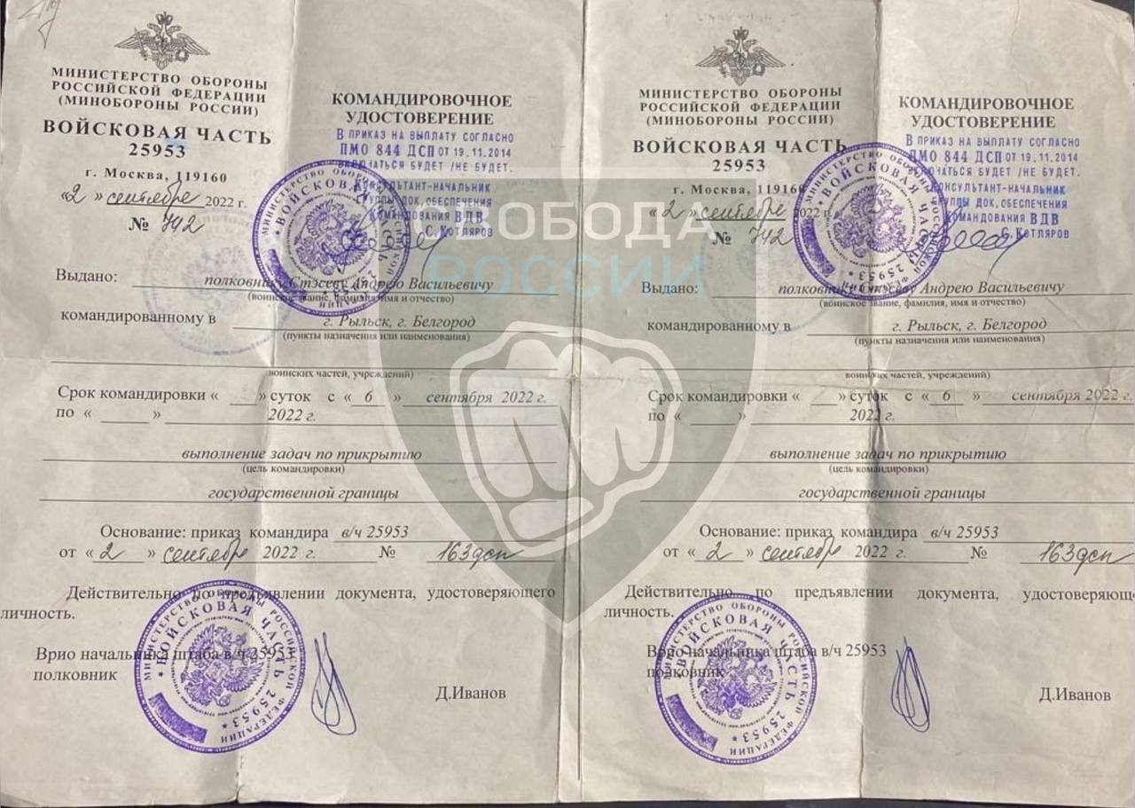 "Согласно оперативной информации, в ночь с 04 на 05 июня в населенном пункте Новая Таволжанка убит гвардии полковник Стэсев Андрей Васильевич - старшей оперативной группировки Белгород. Ранее он занимал должность командира 104 десантно-штурмового полка ВДВ РФ", говорится в сообщении разведки.