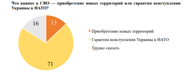 На вопрос, что важнее - новые территории или не вступление Украины в НАТО - 71% россиян заявили, что НАТО важнее.