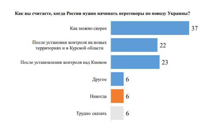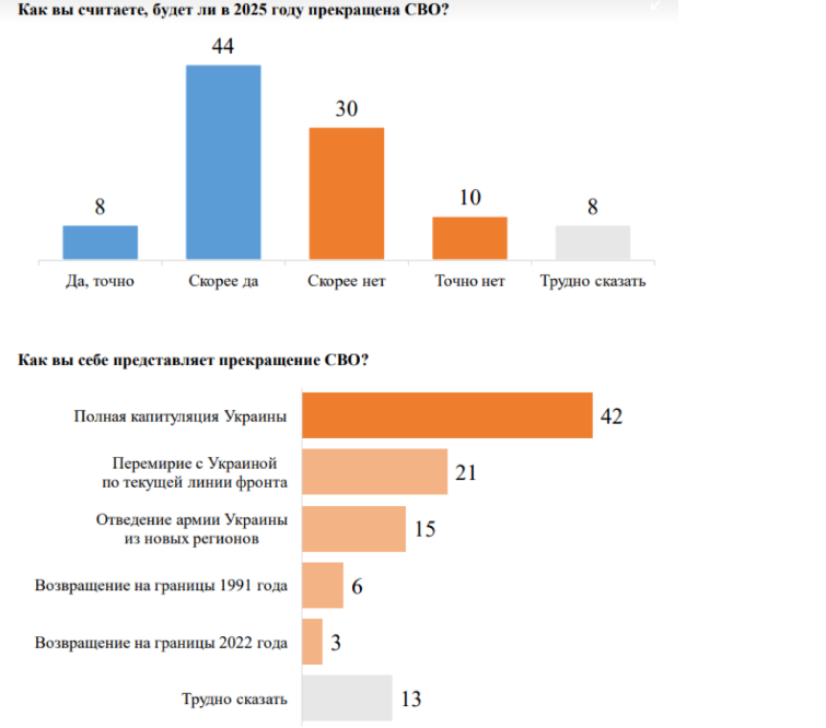 По данным опроса также можно заметить некоторый диссонанс. Ведь большая часть россиян (42%) до сих пор верят, что война завершится, по их мнению, капитуляцией Украины. Вместе с этим 50% опрошенных считают, что РФ скорее не достигла или вообще не достигла поставленных целей в так называемой "сво". Однако это не мешает им думать о "полной капитуляции" и завершении в 2025 году.