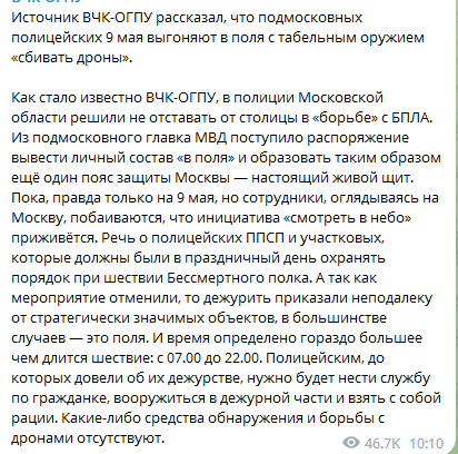 Полицейским из Подмосковья приказали 9 мая, когда в Москве будет проводиться парад, выйти в поля, чтобы из табельного оружия "сбивать дроны".