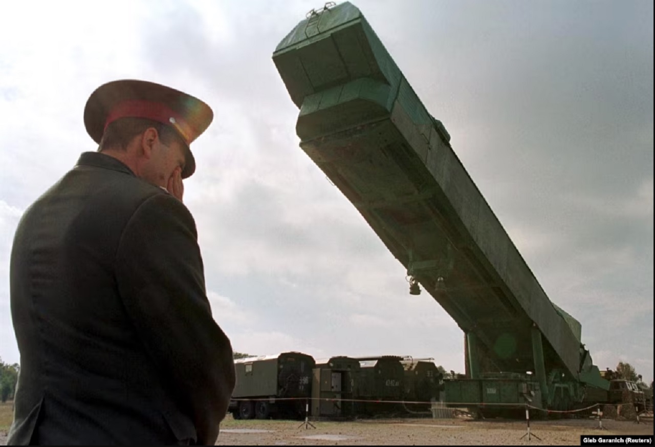 Пусковую установку РС-24 извлекают на военной базе на юге Украины, сентябрь 1998