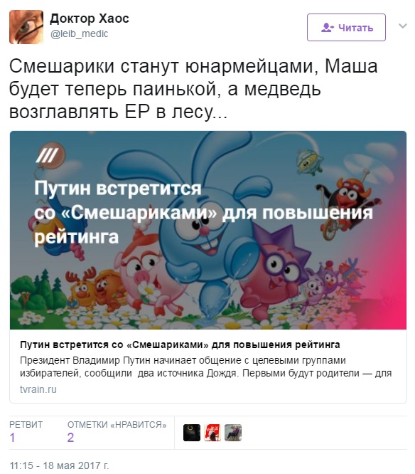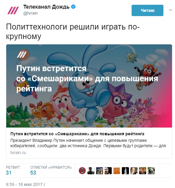 Скорее всего, данная встреча состоится 31 мая, накануне Международного дня защиты детей, и именно эта дата станет формальным поводом для мероприятия. В Кремле активно готовятся к предстоящим президентским выборам и хотят использовать любое видное мероприятие для поддержания высокого рейтинга Путина. Идею встречи президента России с мультипликаторами разработали эксперты внутриполитического блока Кремля.