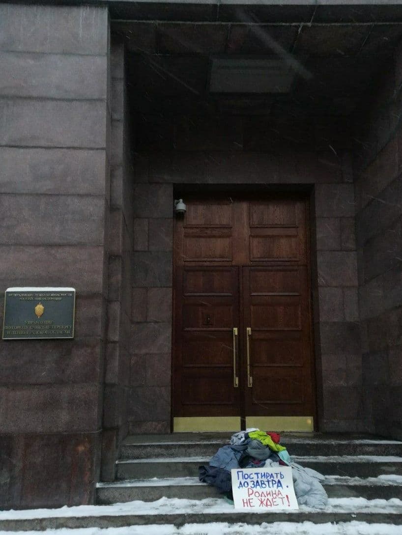 Активисты решили потроллить сотрудников ФСБ и принесли грязное белье к зданию ведомства в Санкт-Петербурге.
