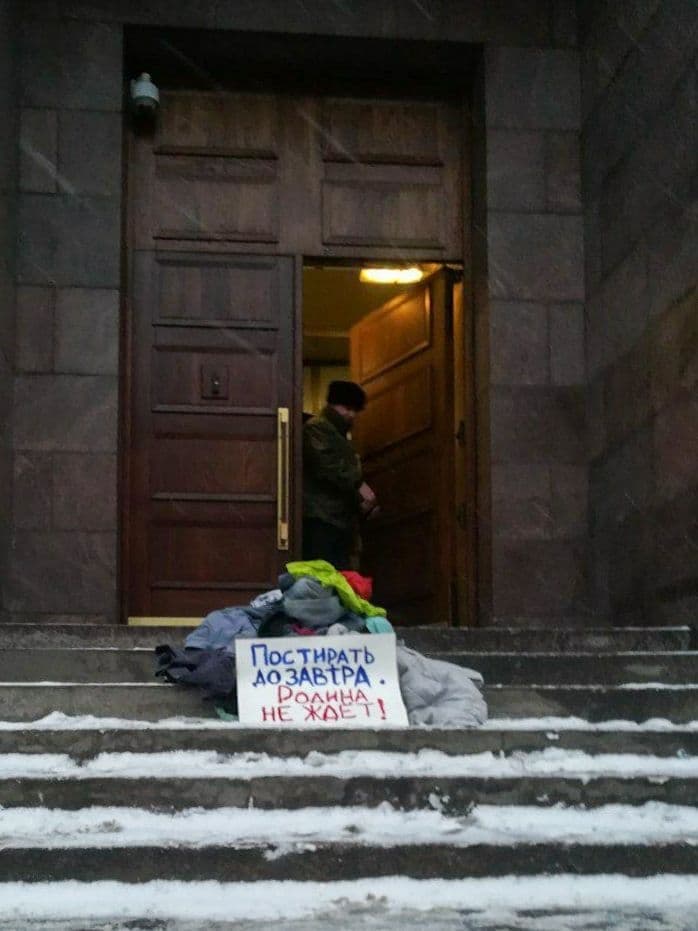 "Служба предлагает простую схему взаимодействия с клиентами: Вы оставляете вещи на главной лестнице здания и они в самое короткое время их заберут, придерживаясь своего главного принципа, выраженного в слогане службы "Родина не ждет!", - добавили активисты в своей публикации.