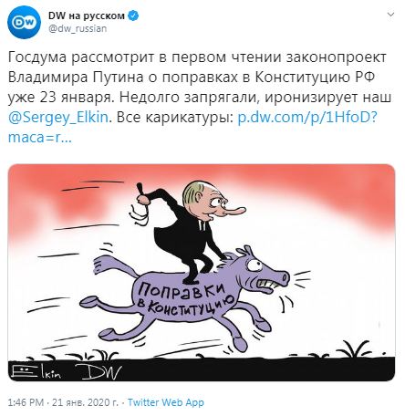 "Госдума рассмотрит в первом чтении законопроект Владимира Путина о поправках в Конституцию РФ уже 23 января. Недолго запрягали, иронизирует наш Сергей Елкин", - пишет автор.
