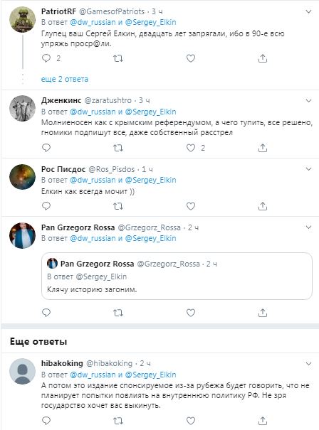 "Молниеносен как с крымским референдумом, а чего тупить, все решено, гномики подпишут все, даже собственный расстрел", "Елкин как всегда мочит","А потом это издание спонсируемое из-за рубежа будет говорить, что не планирует попытки повлиять на внутреннюю политику РФ. Не зря государство хочет вас выкинуть", "Клячу историю загоним", - пишут в коментариях.