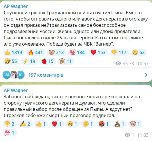 11:07 Связанный с ЧВК "Вагнер" тг-канал уже открыто пишет про свержение Путина.