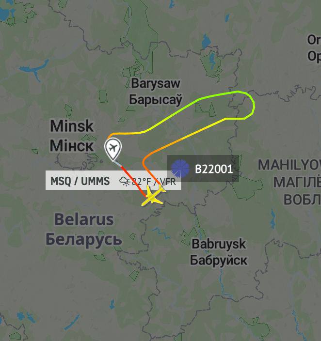 16:56 Белорусский правительственный самолет №1 вылетел из Минска в направлении Москвы, однако так и не преземлился в российской столице, сделав странный круг. Об этом свидетельствуют данные из RadarBox.