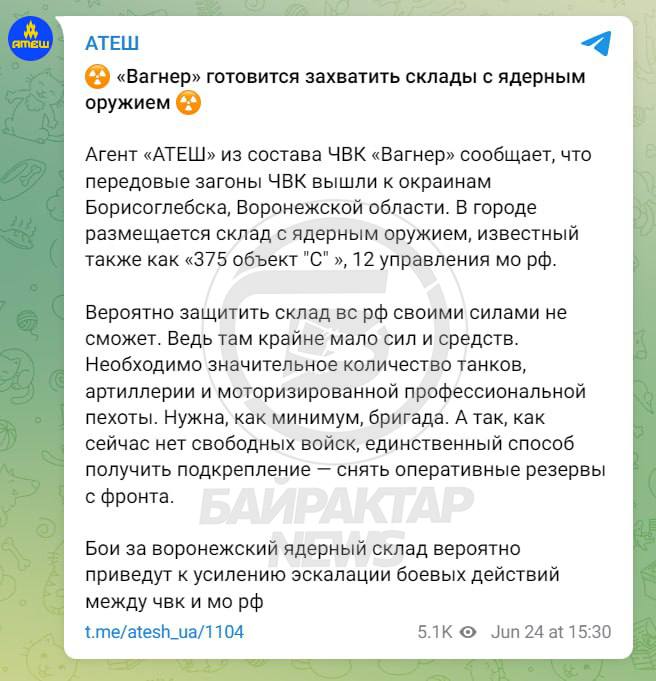 15.51 Отряды ЧВК "Вагнер" вышли к окрестностям Борисоглебска Воронежской области. Там находится склад с ядерным оружием "375 объект "С", 12 управления МО РФ. Об этом сообщили в военном партизанском движении на территориях Украины, оккупированных Россией, а также на территории России "АТЕШ".