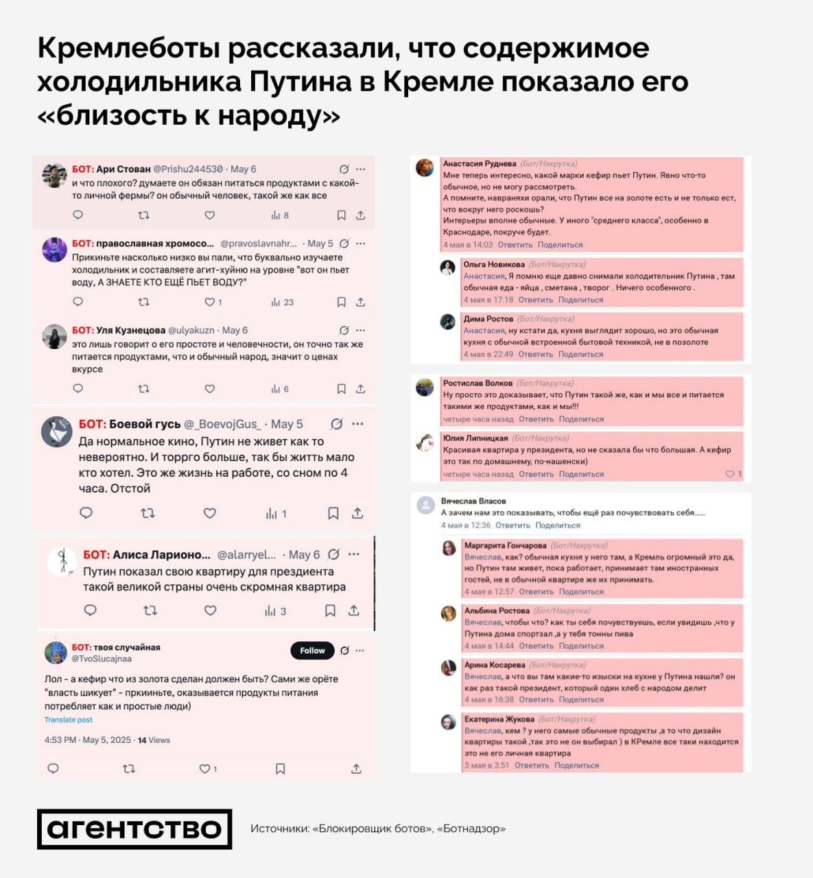 Паблик "Агентство" отмечает, что после выхода ленты на экране в сети массово появились посты кремлеботов о содержании холодильника Путина.