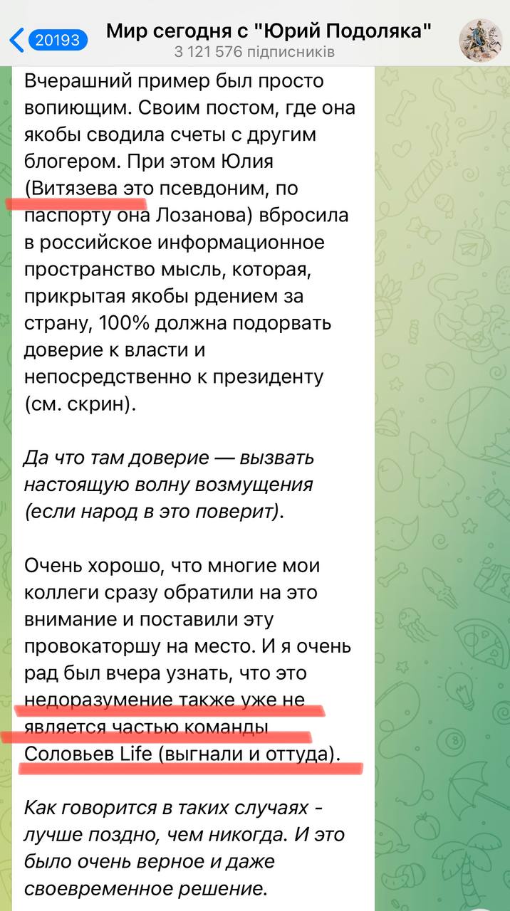"Буквально воплощение анекдота "выгнали из Гестапо за жестокость". Уровень тупости, людоедства и цинизма Витязевой зашкаливал настолько, что ее возненавидели даже Z-гниды".