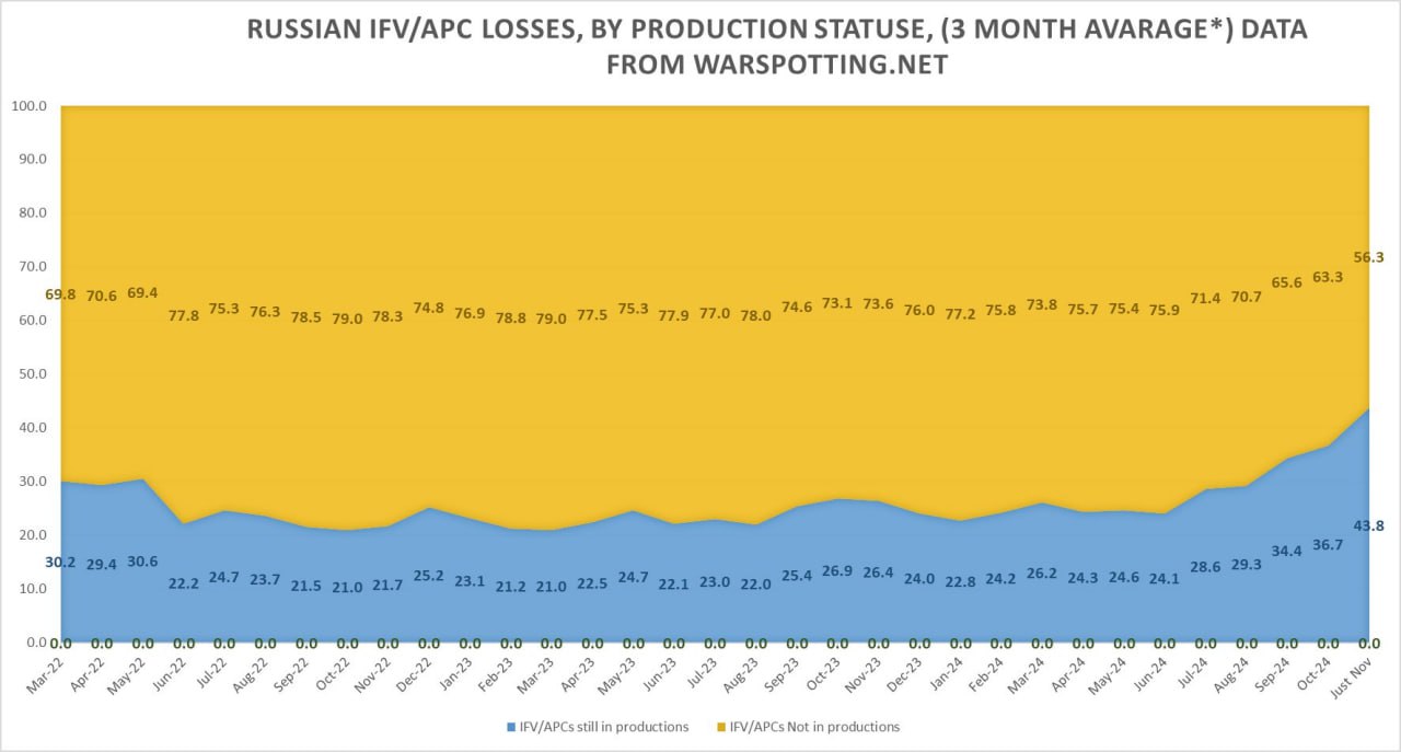 OSINT-исследователь указывает, что причины пока точно установить нельзя. Пишет, что это может быть связано как с увеличением выпуска новой бронетехники, так и с падением темпов реактивации старой с советских баз хранения.