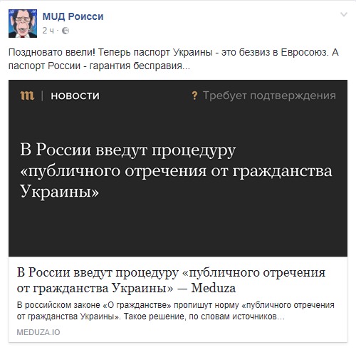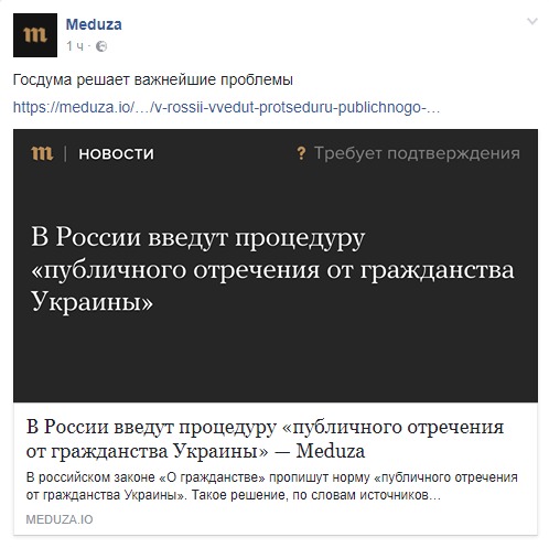 Ранее российские СМИ сообщили об инициативе депутатов Госдумы РФ добавить в законопроект об отмене решения о предоставлении гражданства осужденным за терроризм, позволяющую жителям Украины, которые не могут получить справку о выходе из гражданства нашей страны для вступления в гражданство РФ, норму о возможности официально публично отказываться от него.