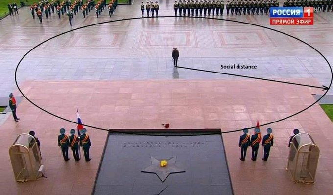 На снимке - Путин во время торжеств стоит абсолютно один на очень большом расстоянии от остальных участников. Вероятно, он опасается "подхватить" коронавирус.