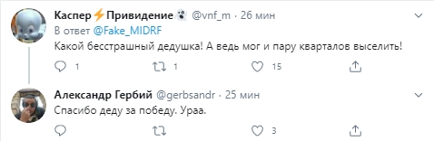 "Какой бесстрашный дедушка! А ведь мог и пару кварталов выселить!", "Спасибо деду за победу. Ура", - пишут комментаторы.