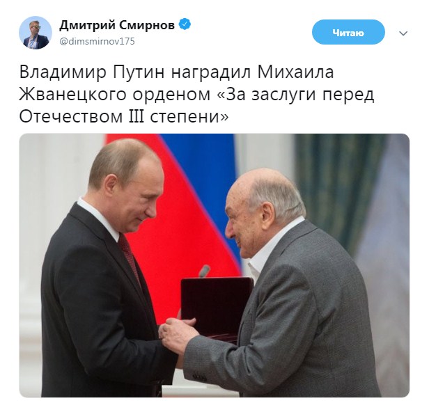 Президент России Владимир Путин вручил орден за вклад в развитие культуры писателю и сатирику Михаилу Жванецкому, выступающему против агрессии РФ в Украине.