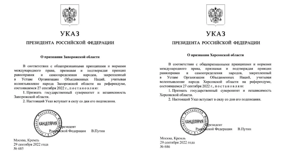 Отметим, что сегодня ночью глава Кремля подписал указы о признании независимости Запорожской и Херсонской областей. Соответствующие "документы" опубликовали на официальном портале правовой информации.