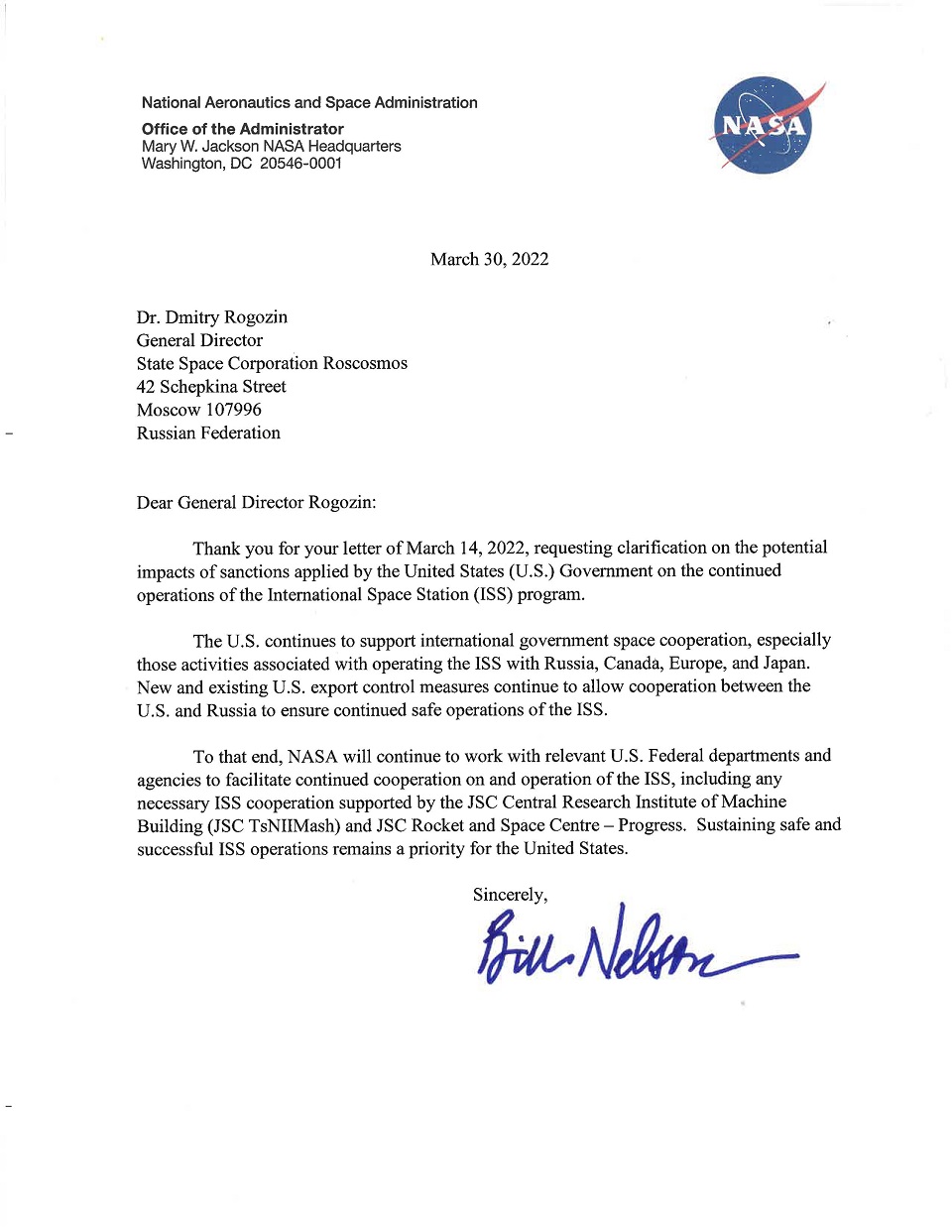 14 марта 2022 года глава "Роскосмоса" Дмитрий Рогозин обратился с письмом к NASA, апеллируя к негативному влиянию санкций на безопасное сотрудничество в сфере космоса, в частности, на работу Международной космической станции (МКС). В NASA предоставили официальный ответ, сообщив, что примененные санкции позволяют продолжать сотрудничество для обеспечения непрерывной безопасной эксплуатации МКС.