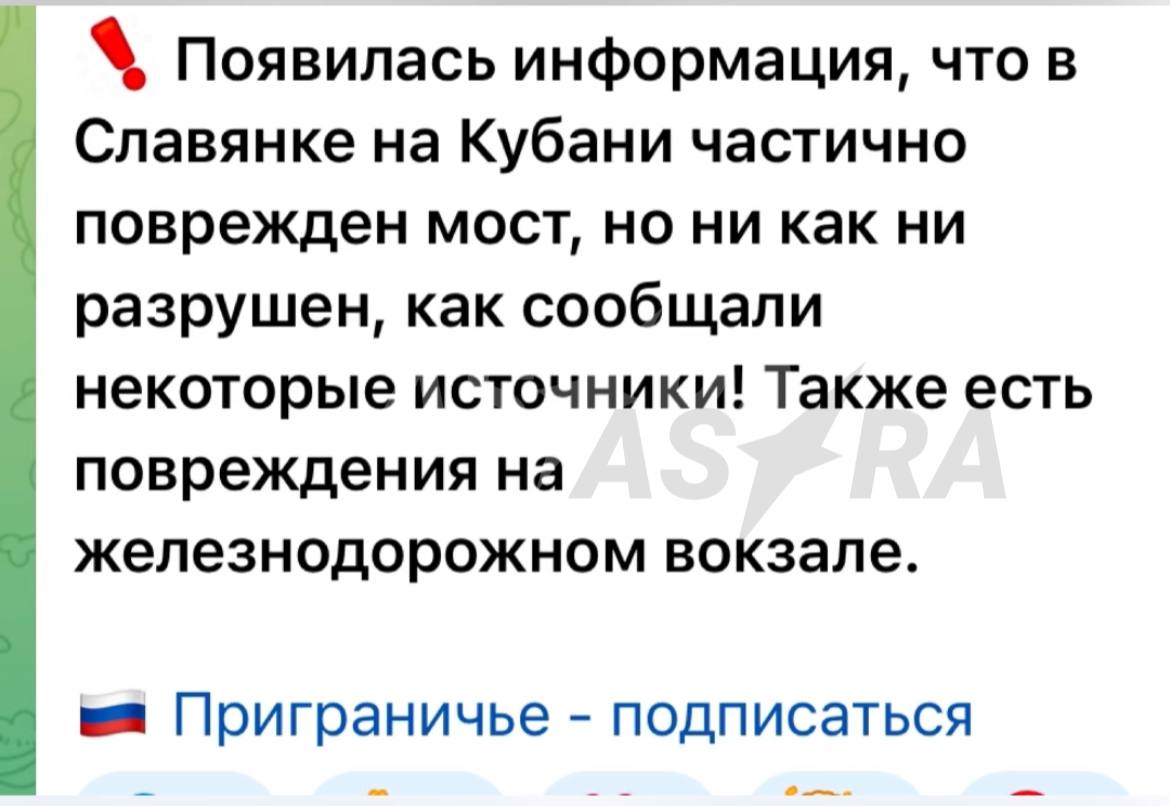 Кроме того, Телеграм-канал ASTRA писал также о том, что был атакован мост через реку Протока, соединяющий Славянск-на-Кубани с хутором Трудобеликовским. Такая же информация появилась в ряде телеграм-каналов. Но жители хутора сообщили, что мост работает, и по нему продолжается движение, подтвердив свои слова видео с места. Некоторые каналы утверждали, что поврежден асфальт на одном из участков моста и местный железнодорожный вокзал.