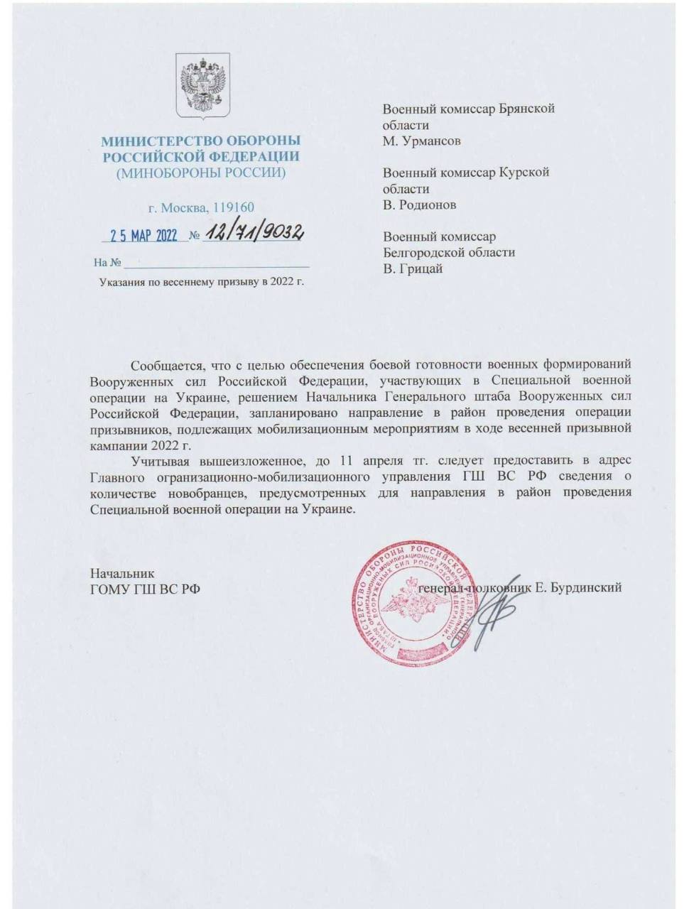 Судя по обнародованному приказу Министерства обороны России, призыв будет проводиться уже с 11 апреля на территории приграничных Курской, Брянской и Белгородской областей РФ.