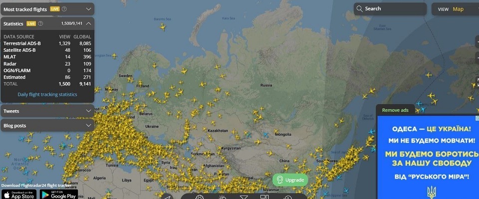 На скриншоте видно, что основная часть самолетов в российском небе наблюдается в ее западной части. Над центральными и восточными территориями РФ нет практически ни одного самолета, поскольку все авиакомпании мира облетают территорию страны-агрессора.