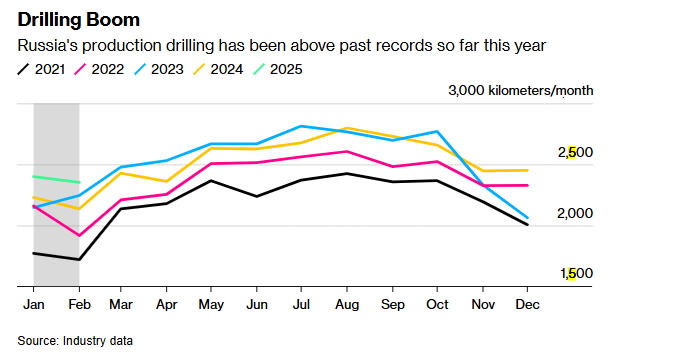 Согласно последним доступным данным агентства Bloomberg, в январе-феврале средний объем эксплуатационного бурения в России составил более 2370 км (7,8 млн футов), что превышает средний сезонный показатель за три года вторжения Кремля в Украину, что повлекло ограничение западных нефтесервисных услуг.